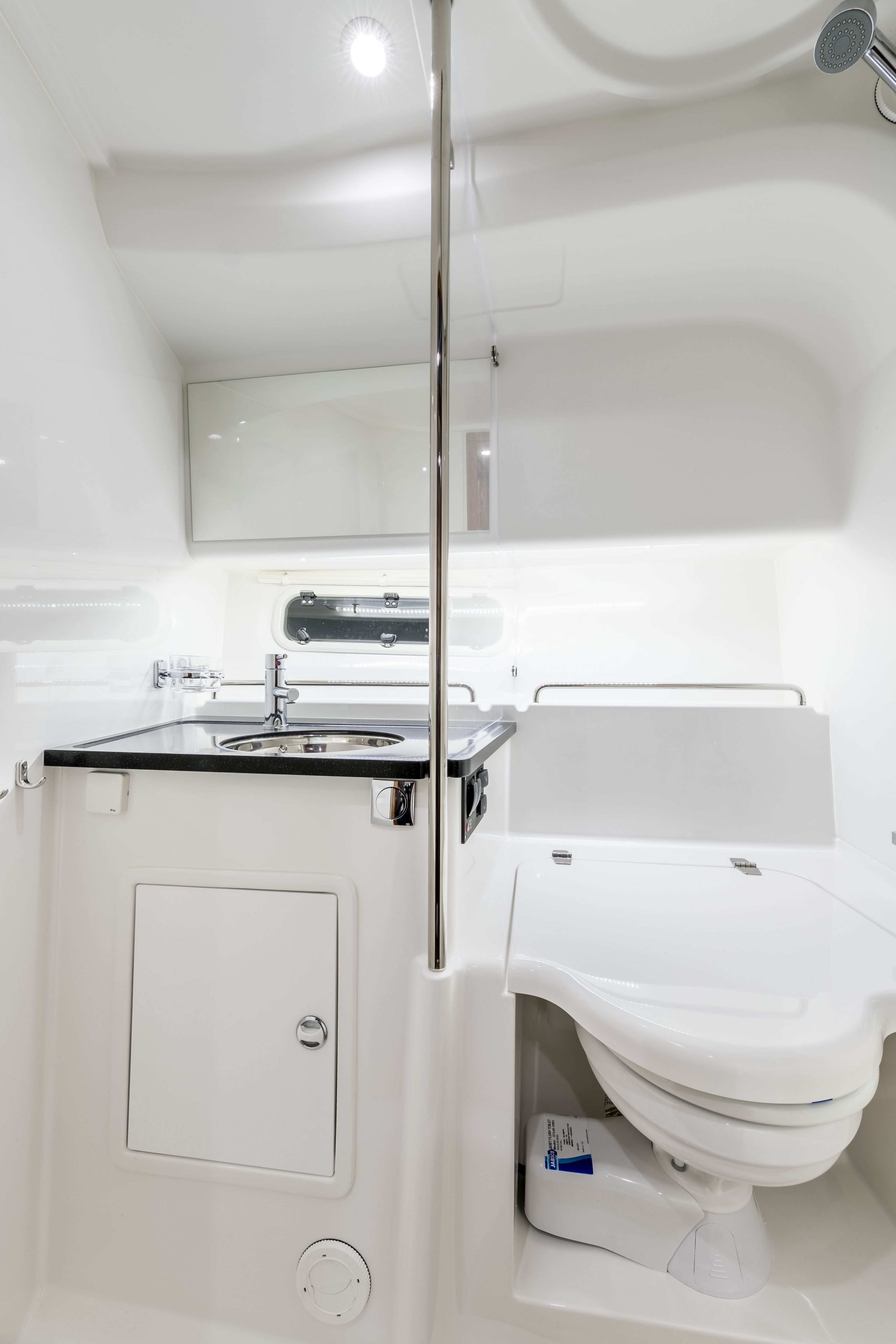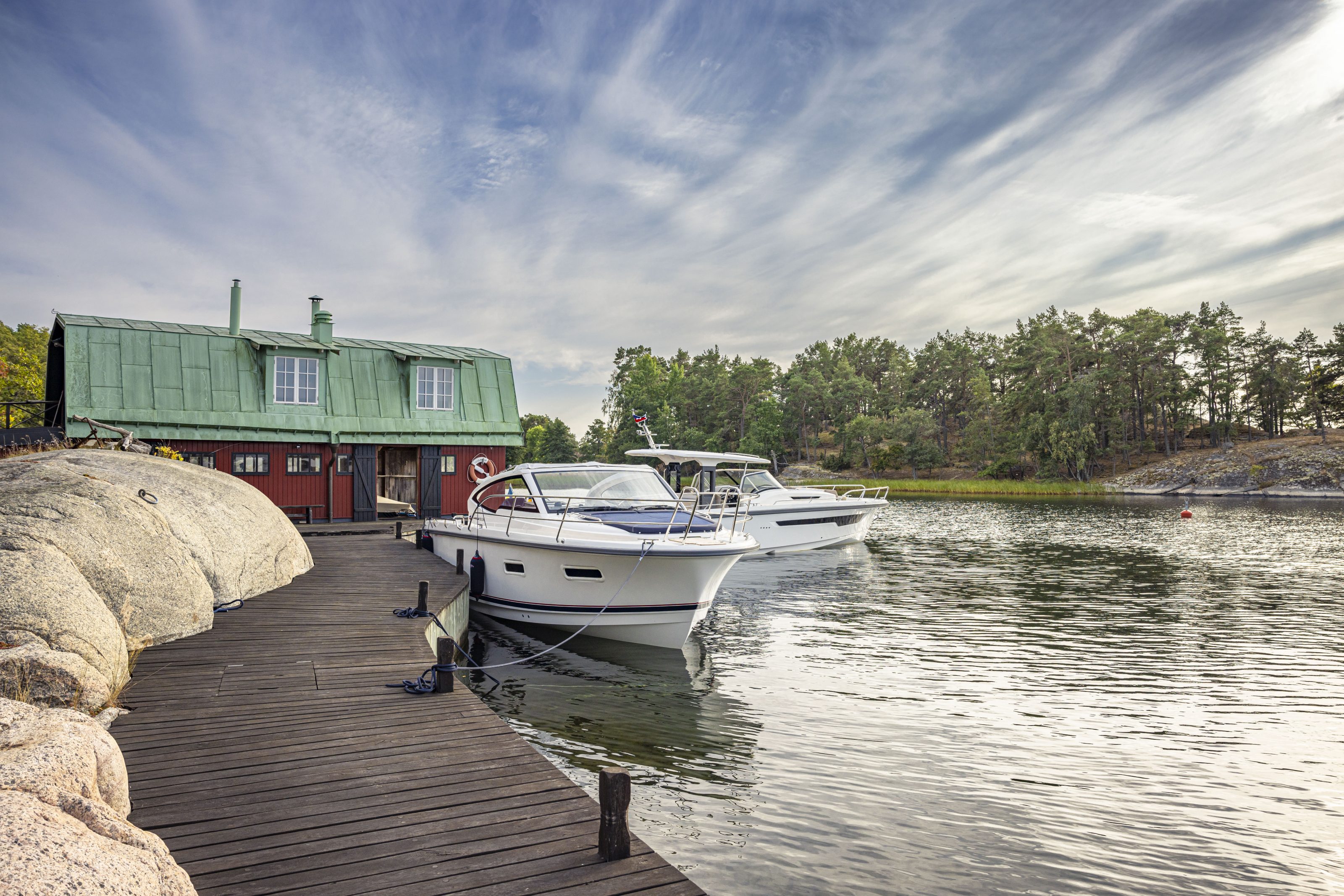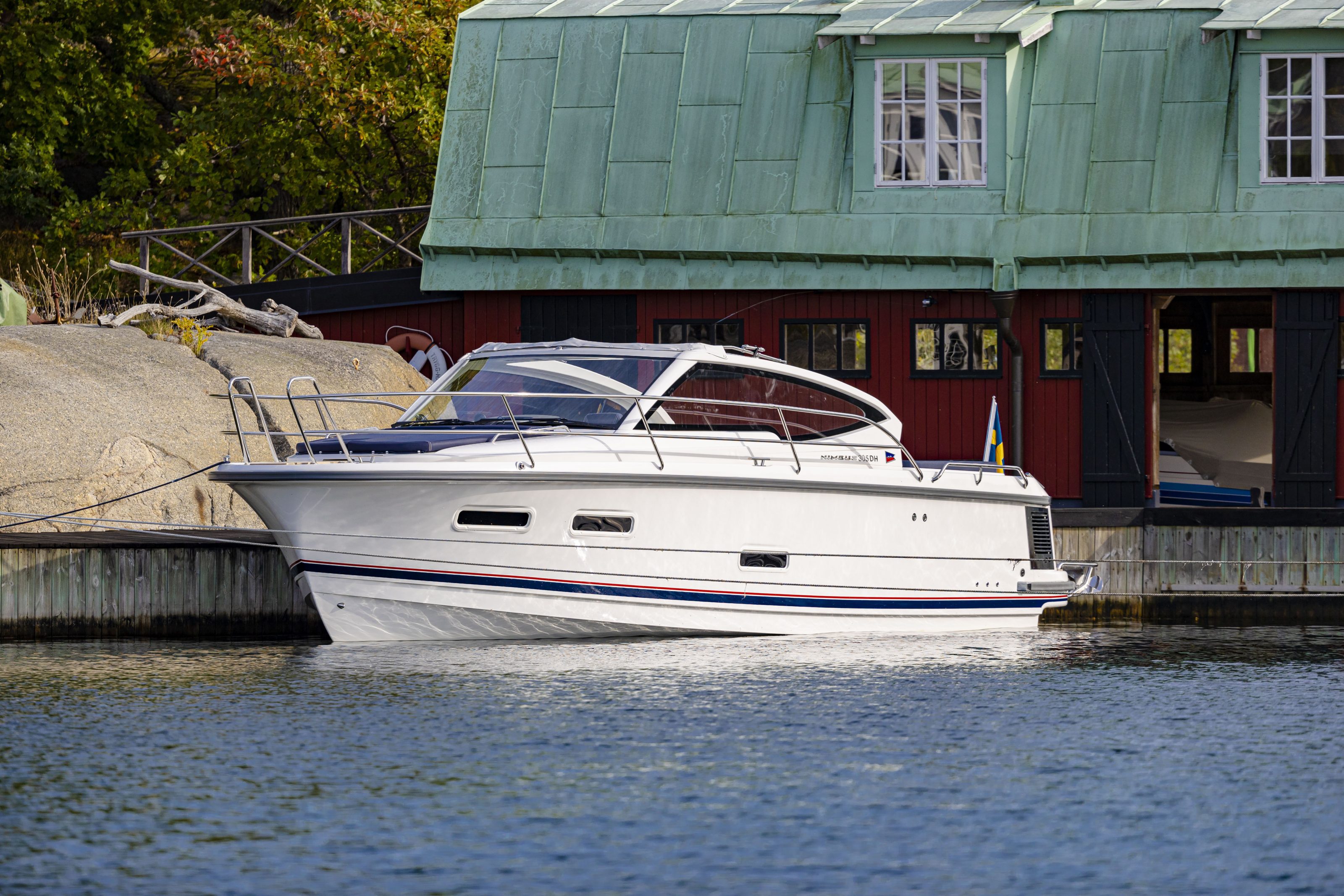The 305 Drophead virtually breathes Scandinavian design and the materials have been selected with utmost care. The interior of the boat exudes sheer quality and feels spacious and airy. The boat is fitted with integrated ventilation and opening port lights for generous light intake. Bulkhead covers in light colored materials reduce noise. Mahogany fittings create a beautiful contrast with the lacquered surfaces and provide a warm atmosphere. Lighting is cleverly designed for both comfort and efficiency. The boat has two very comfortable cabins; the “owners cabin” and a side cabin, sharing the head and shower.