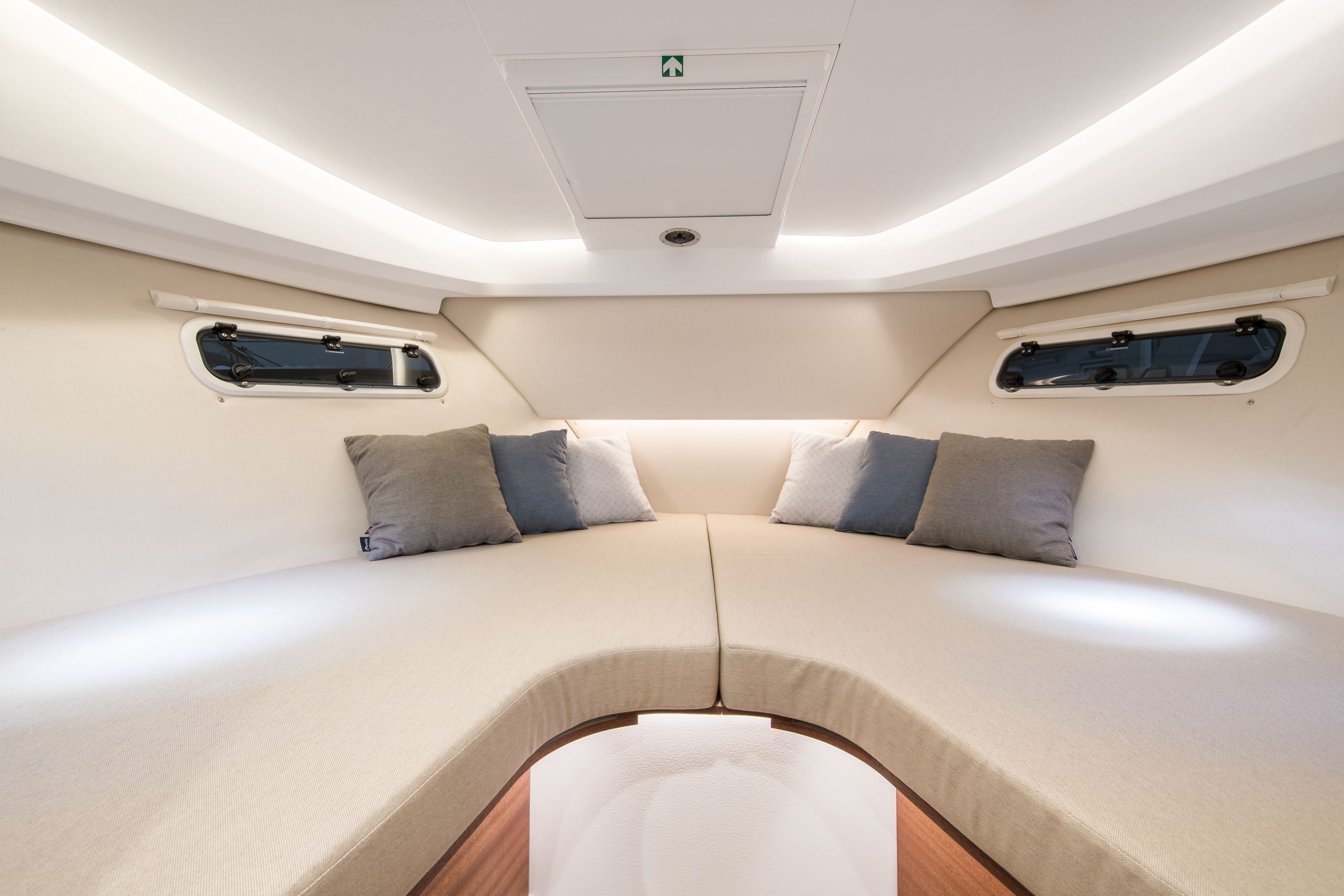 Textiles are in spin-dyed acrylic, a material that is not only hardwearing and withstands salt and sun without fading but is also soft and comfortable to sit on. The colors of the upholstery are light blue and beige. The color scheme and contemporary patterns of the cushions enhance the furnishings. Interior in varnished Mahogany with textiles in light Scandinavian beige or Marine classic blue with Sunbrella light blue technical fabric as option. All lights are LED and with several points of curtesy lights.