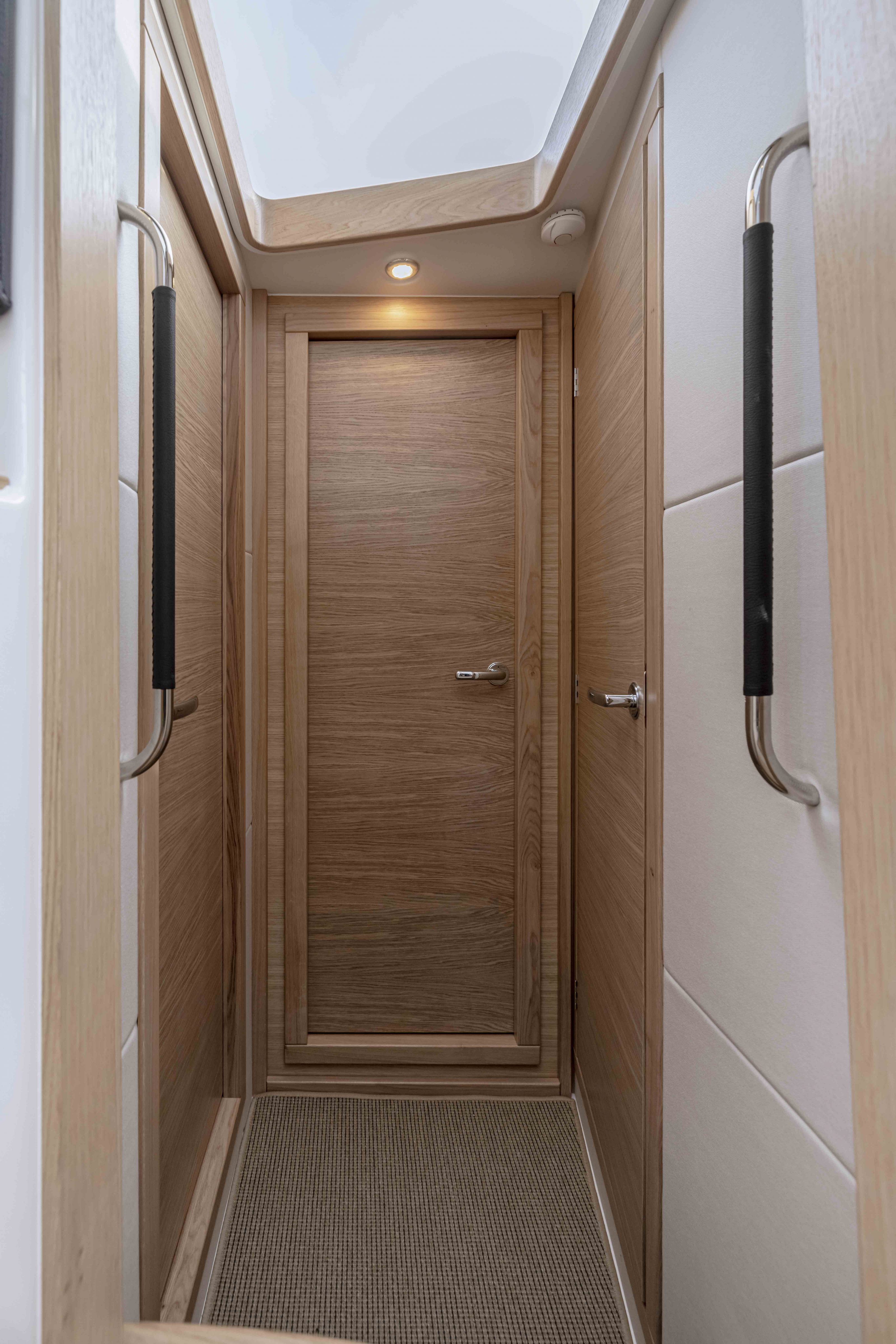 The side door to starboard provides an access to the deck through an extremely generous door opening. The sliding door enables maneuvering or docking alongside from a standing position on the side deck – a function that is used often. The stainless-steel pulpits are divided in the middle allowing better and easier ingress and degress to and from the boat through the opening when laying alongside.