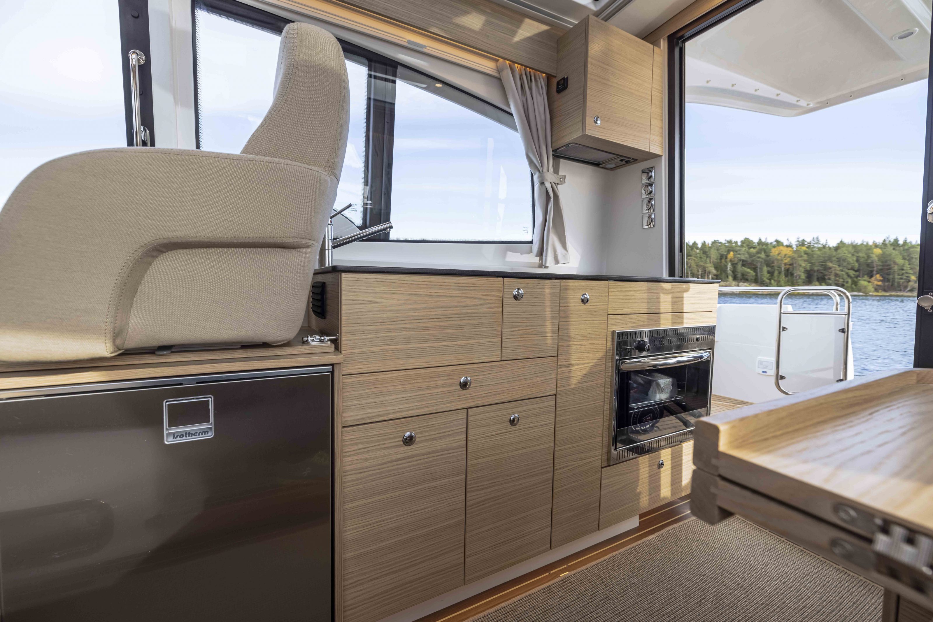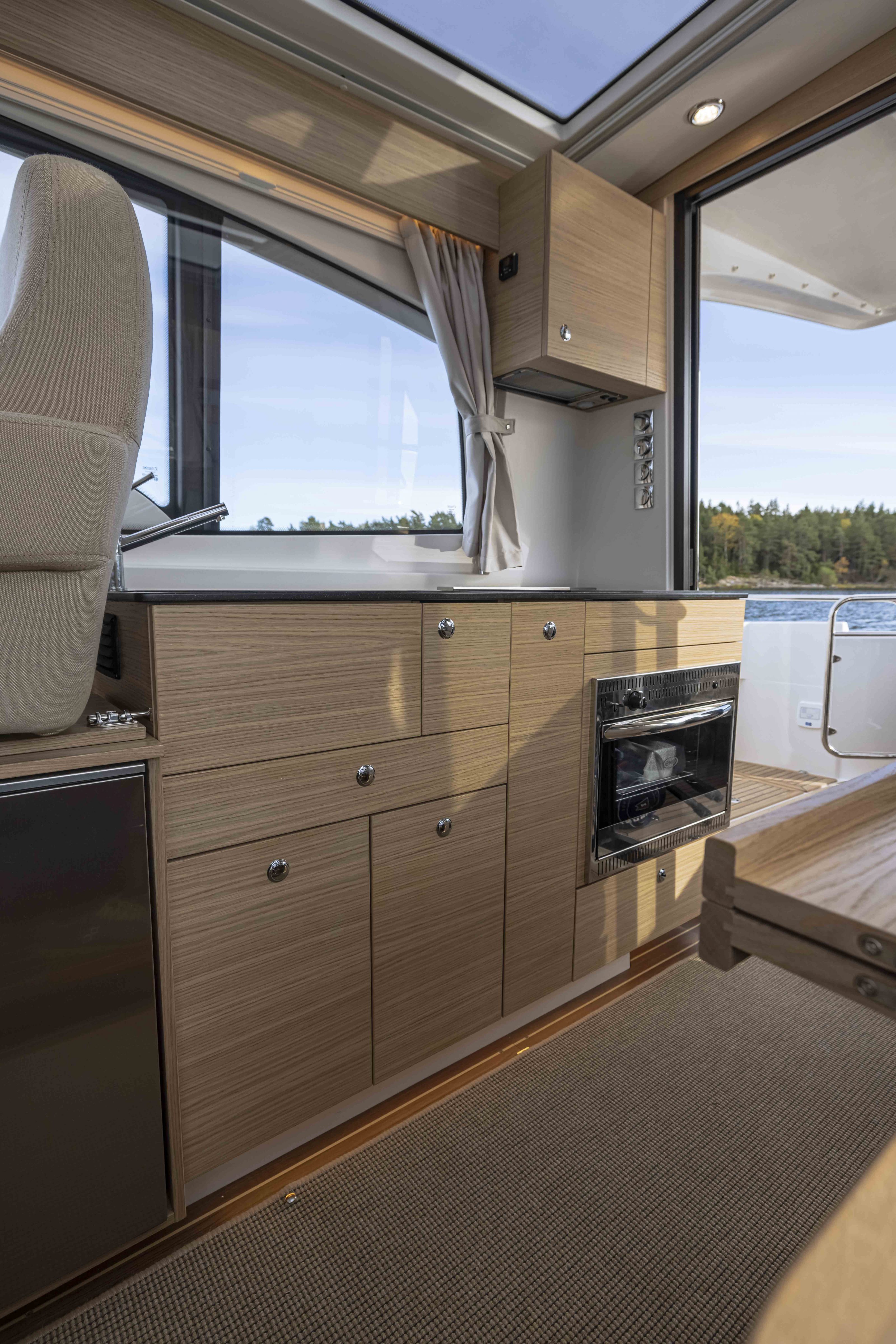 The new modular galley provides more storage space and a wider range of opportunities to meet individual requirement. Options include gas, electric or induction hob, oven or microwave; extra cool box (36 liters), freezer or extra storage lockers. A kitchen fan and extra overhead lockers are also available as an option.