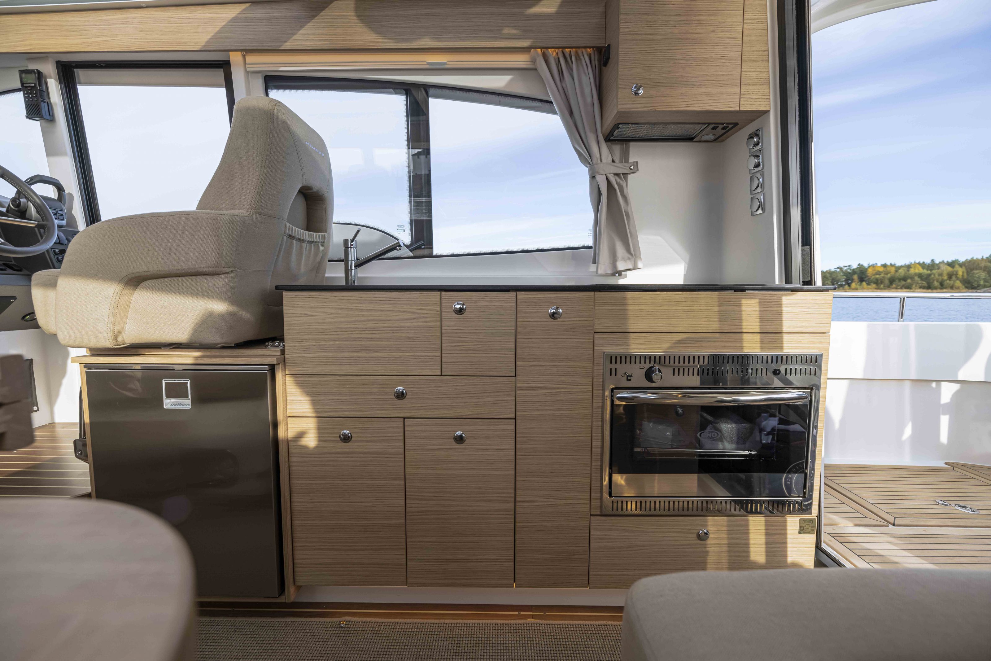 The interior of the 365 offers genuine quality with a beautiful dark mahogany finish, creating a delightful contrast to the light varnished surfaces and adding a feeling of warmth. The boat has two cabins – the master cabin and guest cabin – with a common toilet. One key innovation is that both cabins are equipped with high cupboards/wardrobes for increased storage. The bulkheads in each cabin are fabric-covered in light sound-absorbent material. LED lighting throughout the boat is well appointed and creates a cozy interior. Integrated ventilation makes a considerable difference to air circulation and quality.