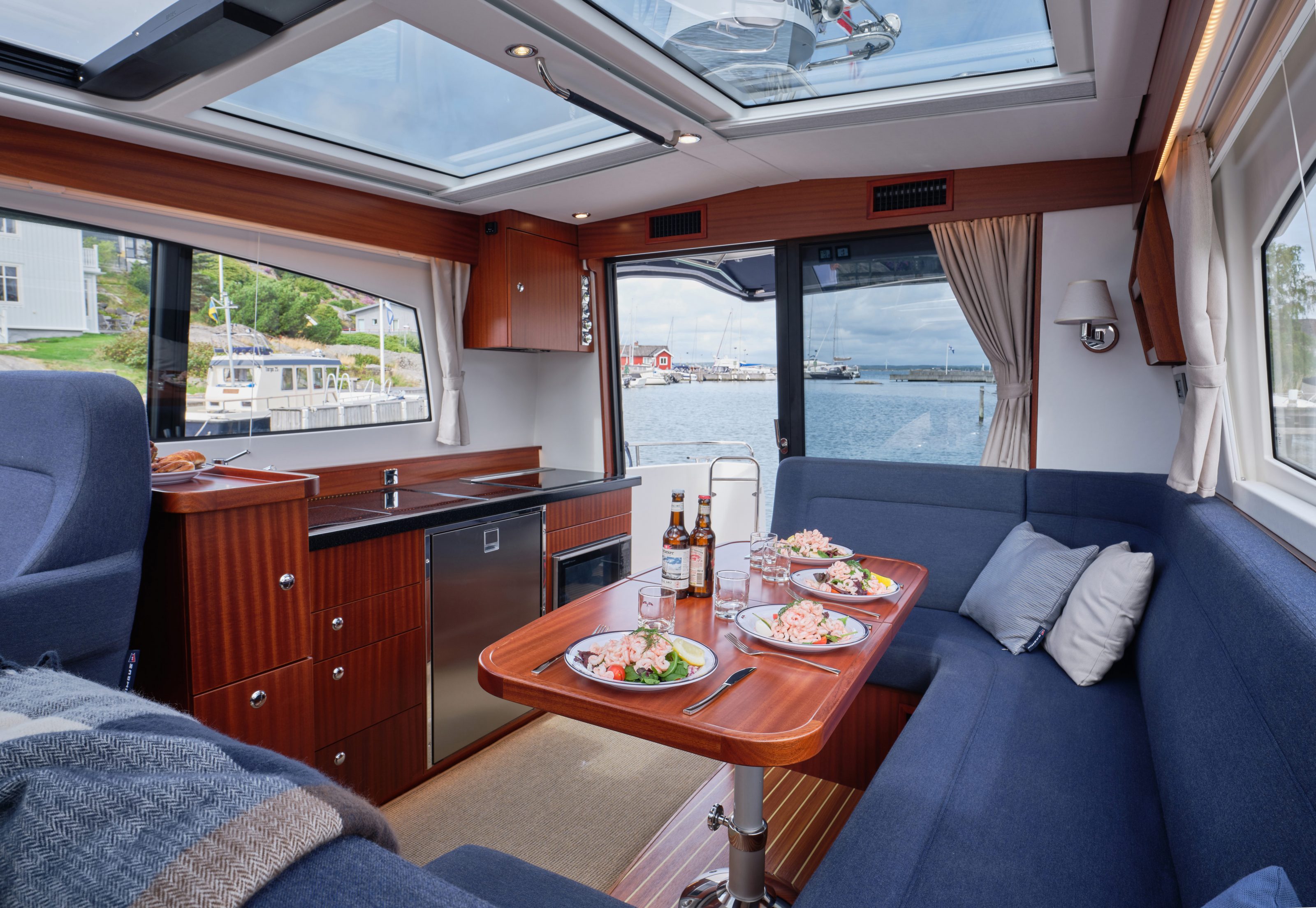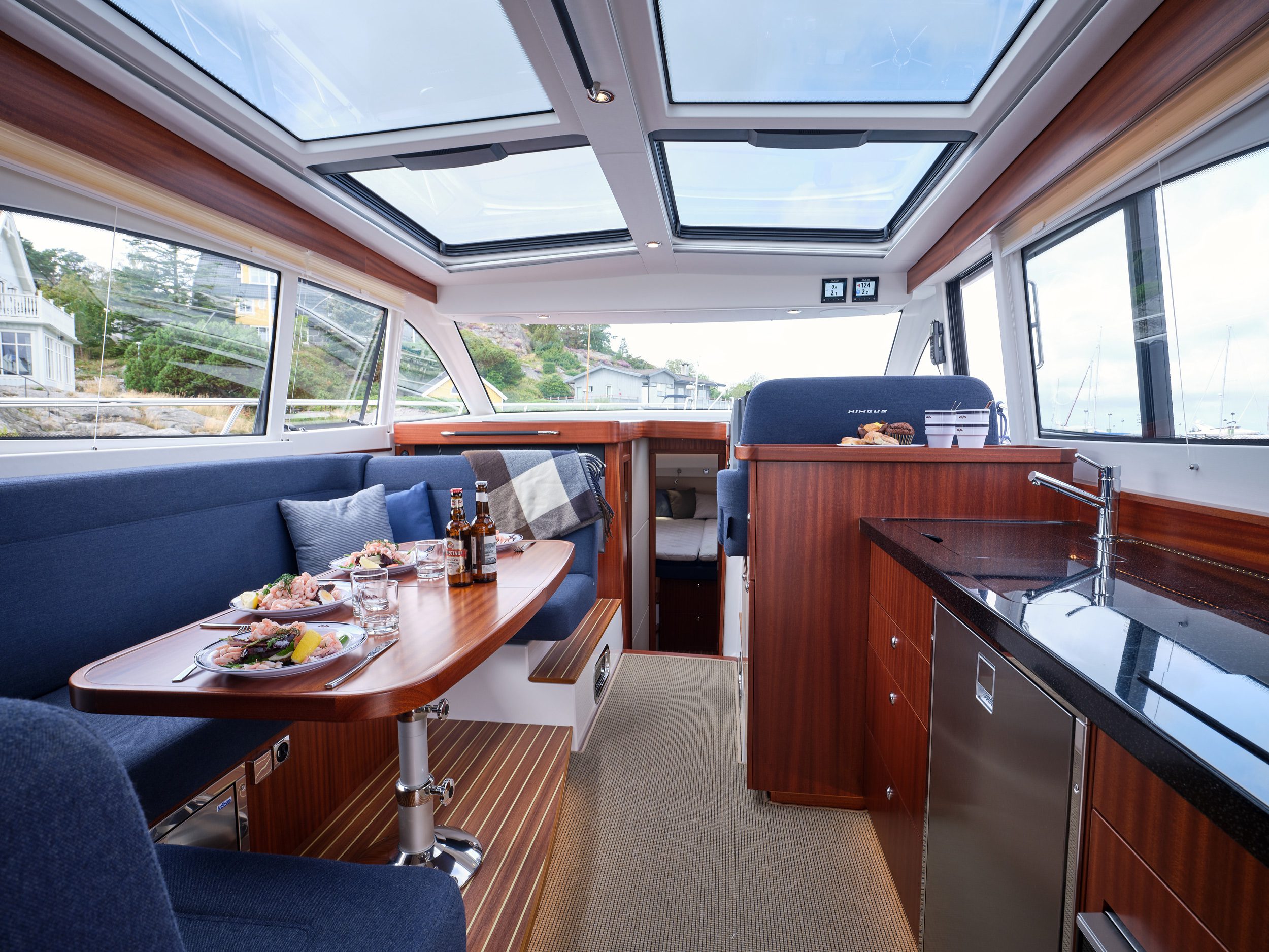 There is seating for four to five facing forward; two seats at the helm and two-three seats at the reversible passenger sofa (the reversible passenger sofa was developed in the seventies for the Nimbus 26 and has been constantly developed and refined ever since).