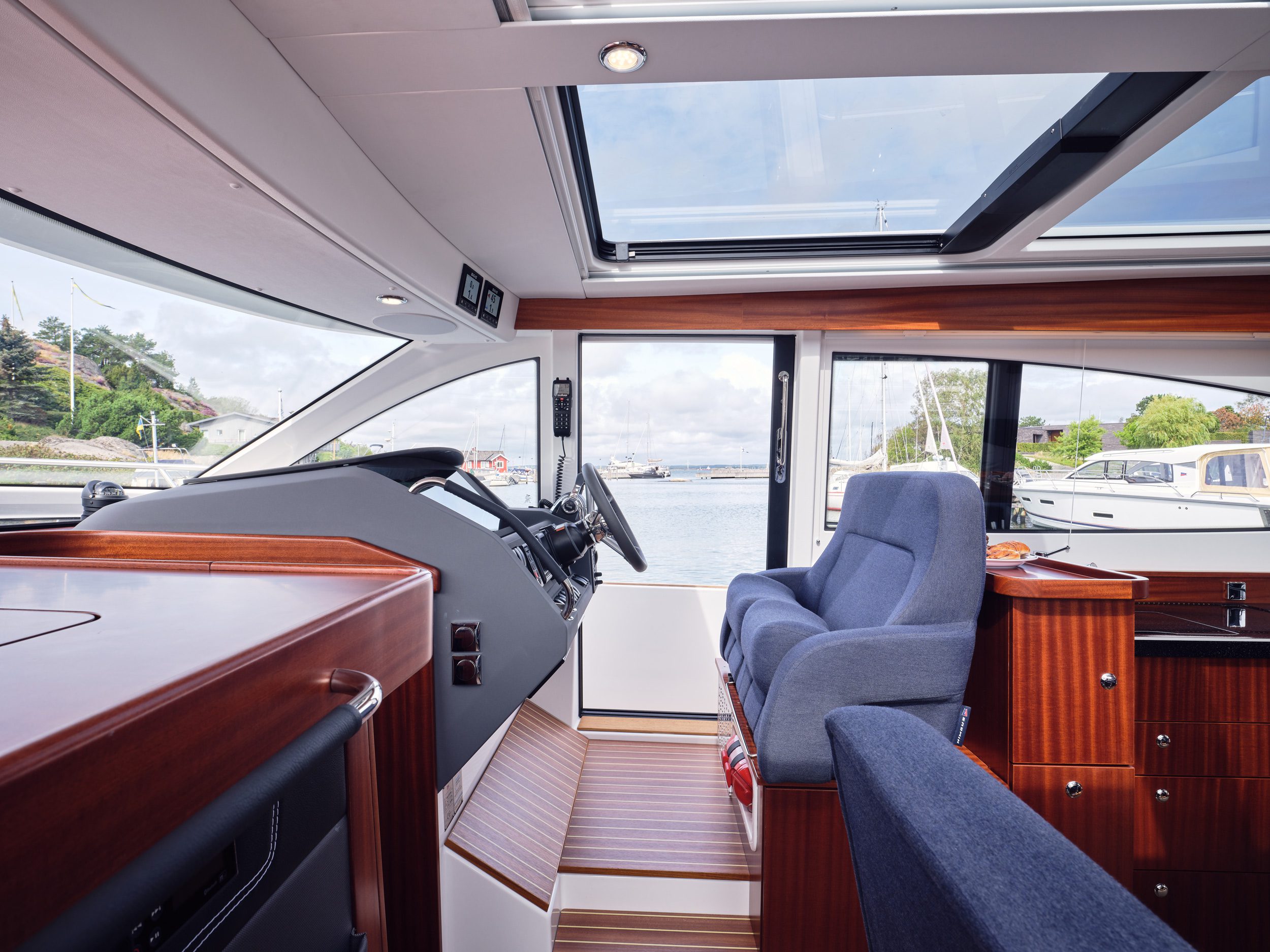 Polyurethane glued windows in the superstructure and a large wrap around windscreen provide a very contemporary look, exceptional stability and a quiet salon. The helm has been re-modeled, and the instrument panel is now fitted with twin 12-inch plotters. Visibility is exemplary thanks to uncluttered surfaces (nothing gets in the way), matte finish anti-reflecting materials and integrated folding wipers. A large flush-fitted sliding door at the helm and large sliding glass roof with integrated sun blinds maximize visibility even further.