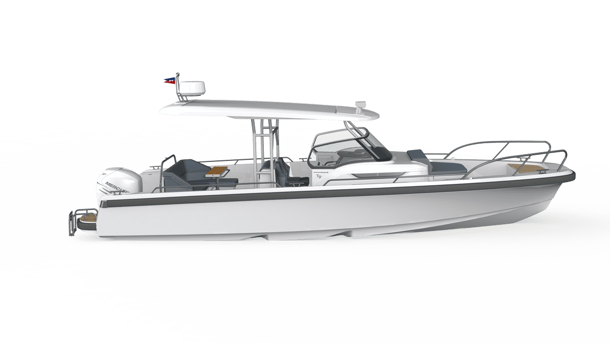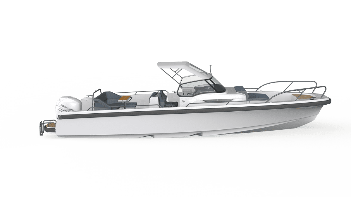 The T9 is equipped with single or twin Mercury outboard engines. The aft deck u-sofa with seating for 5 easily converts to a sunbed. There is an option for a wet bar with a hand basin and portable Weber LPG grill behind the helm seat. The module also functions as support while on the water or in port. The boat is available with three different canopy solutions – harbor cover, spray hood, or as a T-top design. The helm can be equipped with single 9″, 12″, 16″, or twin 12″ chart plotters. The foredeck features a large loading hatch with access to the cabin as well as an optional daybed which creates an extra seating area that seats 4 people with a table or extended sunbed.