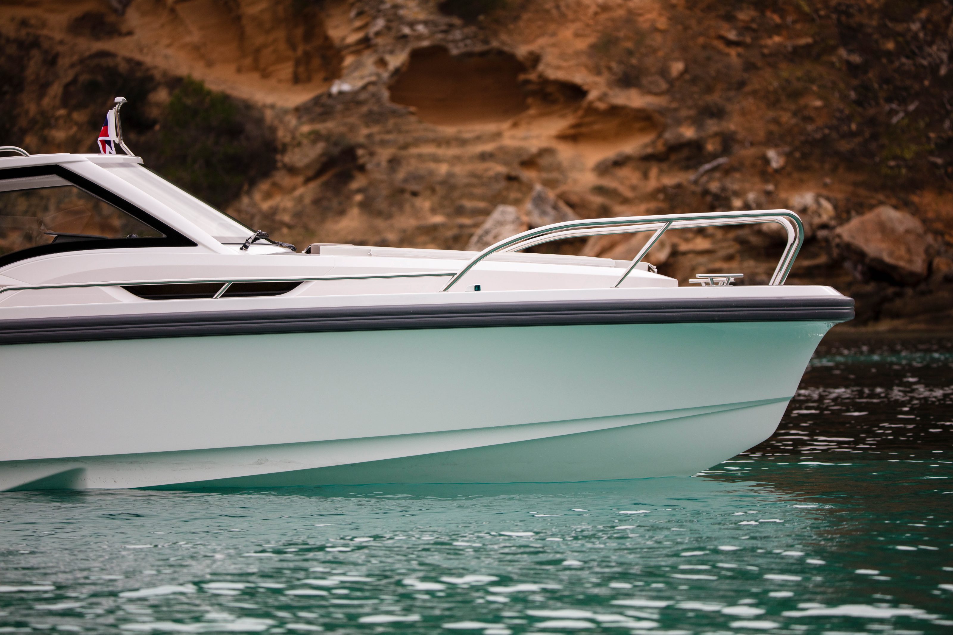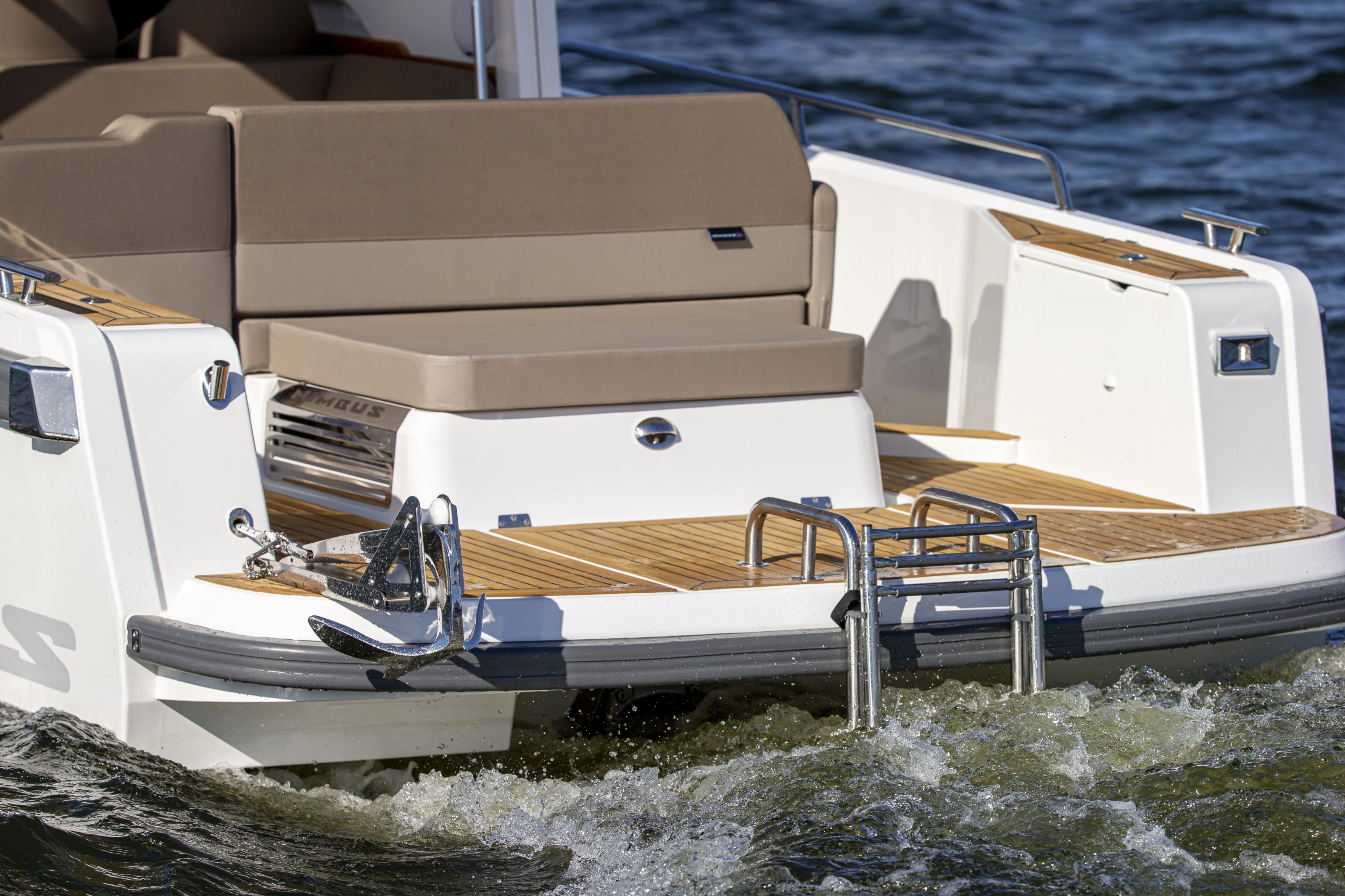 Among the design elements that will be easily recognized are the interior layout, which has many similarities to the 26 Epoca and 32 Ballista, the broad fore deck for extra safety and ease of boarding and disembarking, a feature of the Max II, the design of the side windows from the 22 Spectra, the design and function of the window frame with integrated canvas hood cover from the 305 Drophead, the air-lubricated stepped hull introduced to the Nimbus family with the R-series in 2000, and much more.