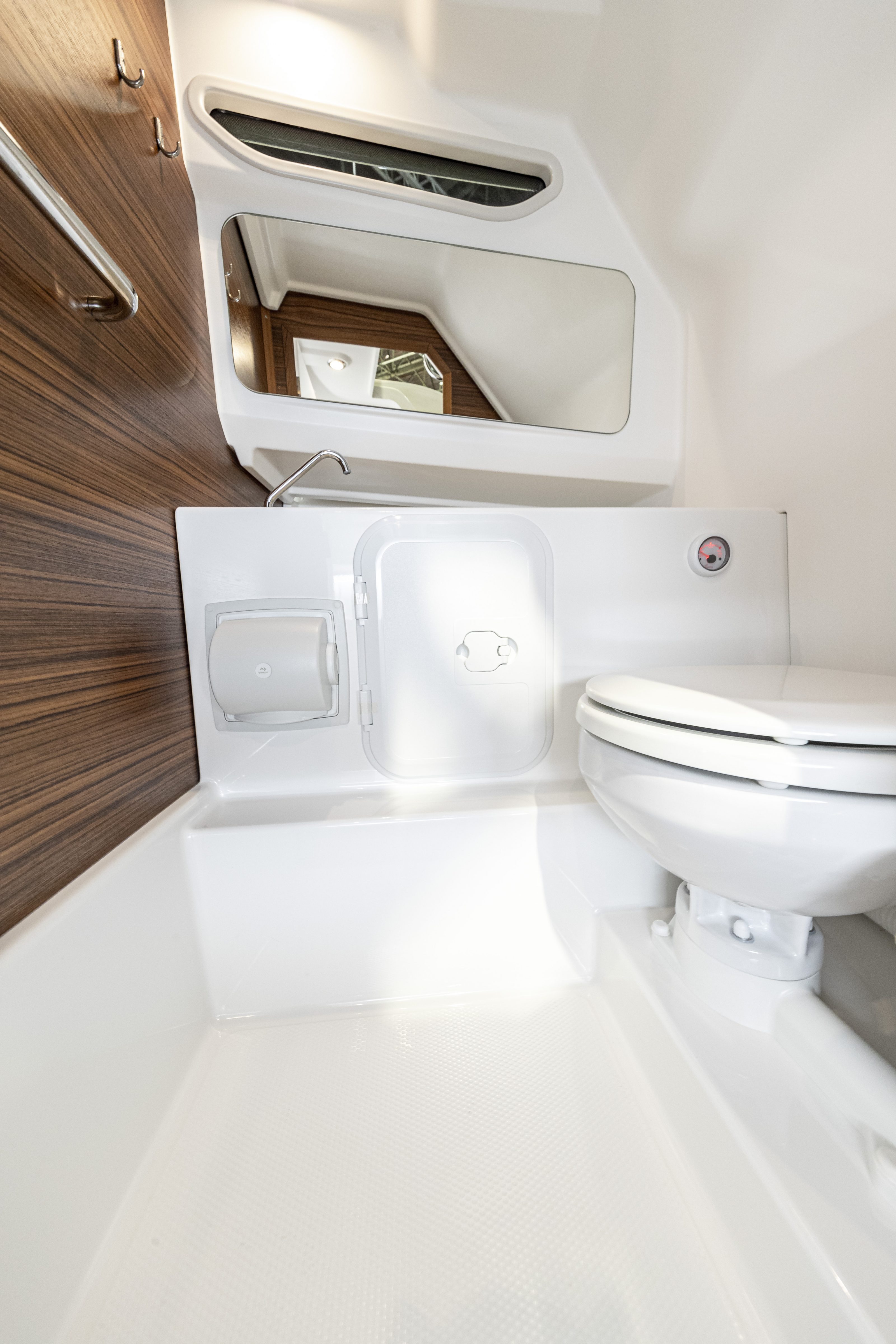 Below deck there is a two-person berth with integrated ventilation, LED lighting, ample stowage and a separate head with sink. A galley facility is available via a retractable gas burner, as well as an optional wet bar with wash basin on the port side of the cabin.