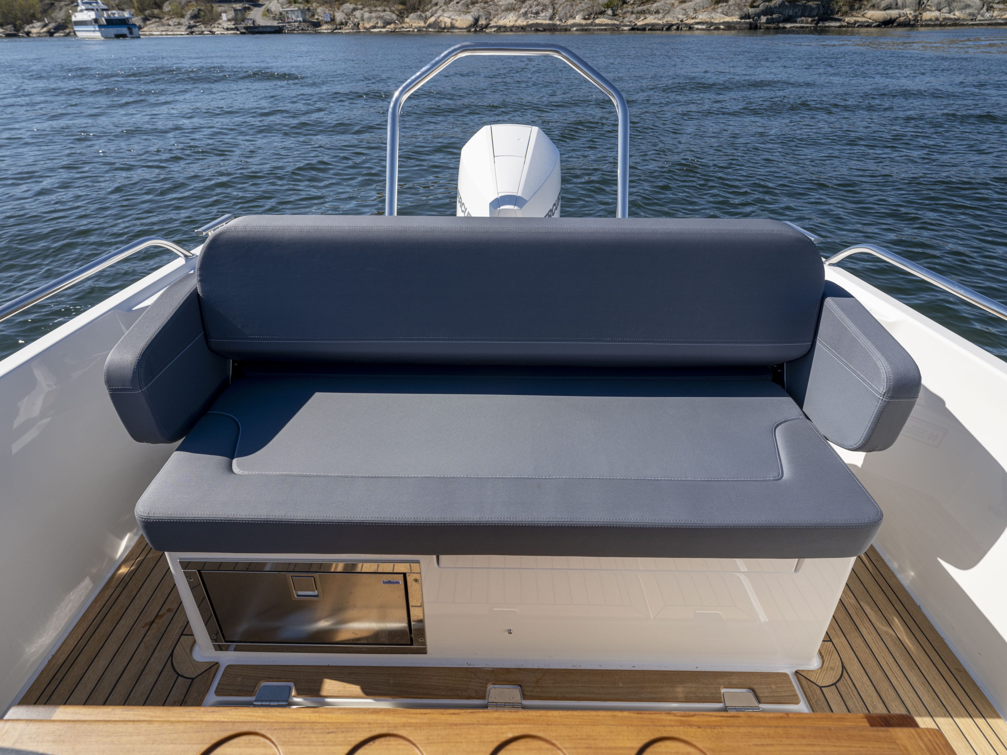 Under the aft sofa there is a retractable refrigerator and an easily accessible storage compartment for storing equipment. On the aft deck there is also a shower outlet and two side storage compartments.
