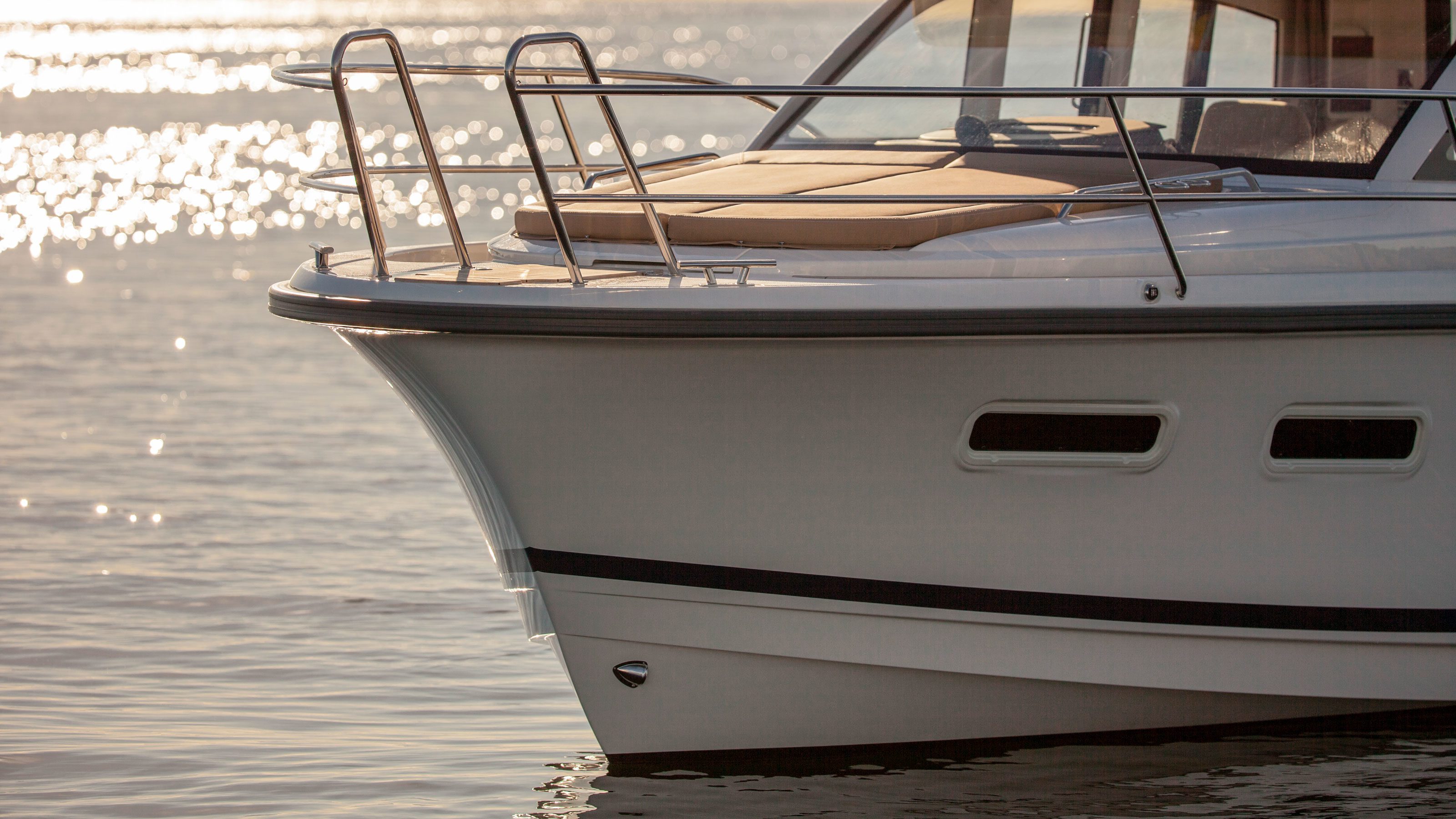 The sliding door provides quick access when laying alongside and enables the captain to maneuver the boat from a standing position on the side deck. The sidewalk concept also allows the use of the aft deck for various activities. And on the foredeck the extra space is used to integrate a large sun deck as a natural feature of the boat’s design.